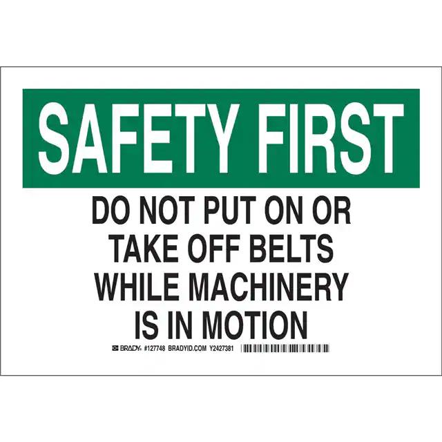 This is manufactured by Brady Corporation. The manufacturer part number is 127749. Label with a size of 14.00" l x 10.00" w (355.6mm x 254.0mm). The product is rohs3 compliant. It is assigned with possible HTSUS value of 8310.00.0000. It is shipped in bulk. It has a classic black and green legend, white background colour. The product brady®, is a highly preferred choice for users. The product is made from highly stable and reliable aluminum. In addition, it is reach unaffected. Its typical moisture sensitivity level is not applicable. A bespoke label is a safety first. do not put on or take off belts while machinery is in motion label. The product is suitable for use with warning. It has a long 4 weeks standard lead time. The product is designated with the ear99 code number
