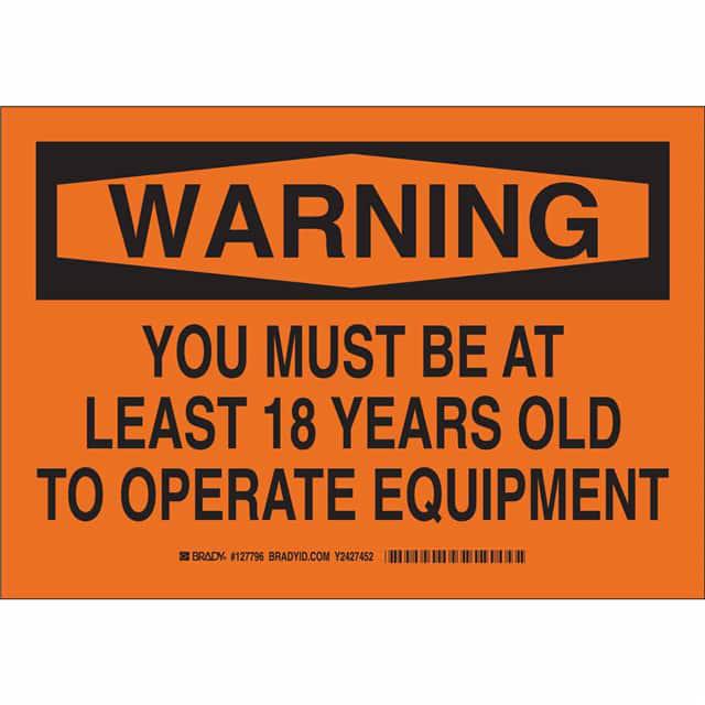 This is manufactured by Brady Corporation. The manufacturer part number is 127799. Label with a size of 14.00" l x 10.00" w (355.6mm x 254.0mm). The product is not applicable. It is assigned with possible HTSUS value of 3926.90.9985. It is shipped in bulk. It has a classic black legend, orange background colour. The product brady®, is a highly preferred choice for users. The product is made from highly stable and reliable polyester. In addition, it is reach unaffected. Its typical moisture sensitivity level is not applicable. A bespoke label is a warning. you must be at least 18 years old to operate equipment label. The product is suitable for use with warning. It has a long 4 weeks standard lead time. The product is designated with the ear99 code number