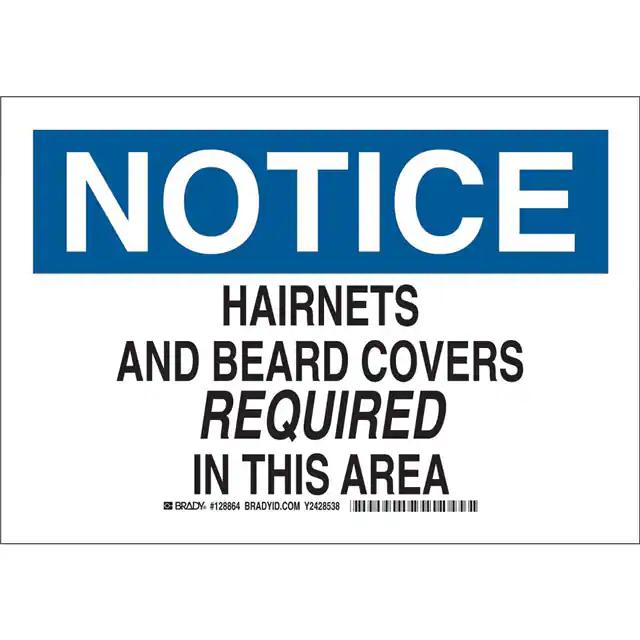This is manufactured by Brady Corporation. The manufacturer part number is 128867. Label with a size of 14.00" l x 10.00" w (355.6mm x 254.0mm). The product is rohs3 compliant. It is assigned with possible HTSUS value of 3926.90.9985. It is shipped in bulk. It has a classic black and blue legend, white background colour. The product brady®, is a highly preferred choice for users. The product is made from highly stable and reliable polyester. In addition, it is reach unaffected. Its typical moisture sensitivity level is not applicable. A bespoke label is a notice. hairnets and beard covers required in this area label. The product is suitable for use with notice. It has a long 4 weeks standard lead time. The product is designated with the ear99 code number