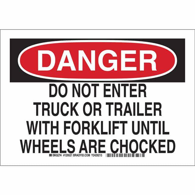 This is manufactured by Brady Corporation. The manufacturer part number is 129524. Label with a size of 14.00" l x 10.00" w (355.6mm x 254.0mm). The product is rohs3 compliant. It is assigned with possible HTSUS value of 3926.90.9985. It is shipped in bulk. It has a classic black and red legend, white background colour. The product brady®, is a highly preferred choice for users. The product is made from highly stable and reliable polyester. In addition, it is reach unaffected. Its typical moisture sensitivity level is not applicable. A bespoke label is a danger. do not enter truck or trailer with forklift until wheels are chocked label. It has a long 4 weeks standard lead time. The product is designated with the ear99 code number