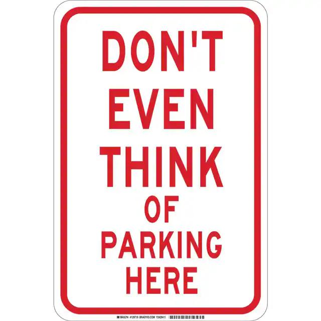 This is manufactured by Brady Corporation. The manufacturer part number is 129717. Label with a size of 18.00" l x 12.00" w (457.2mm x 304.8mm). The product is rohs3 compliant. It is assigned with possible HTSUS value of 8310.00.0000. It is shipped in bulk. It has a classic red legend, white background colour. The product brady®, is a highly preferred choice for users. The product is made from highly stable and reliable aluminum. In addition, it is reach unaffected. Its typical moisture sensitivity level is not applicable. A bespoke label is a don't even think of parking here label. It has a long 4 weeks standard lead time. The product is designated with the ear99 code number