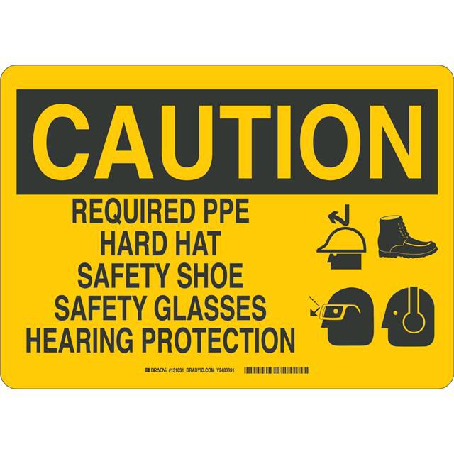 This is manufactured by Brady Corporation. The manufacturer part number is 131031. Label with a size of 14.00" l x 10.00" w (355.6mm x 254.0mm). The product is rohs3 compliant. It is assigned with possible HTSUS value of 3926.90.9985. It is shipped in bulk. It has a classic black legend, yellow background colour. The product brady®, is a highly preferred choice for users. The product is made from highly stable and reliable fiberglass. In addition, it is reach unaffected. Its typical moisture sensitivity level is not applicable. A bespoke label is a caution. required ppe hard hat safety shoe safety glasses hearing protection label. The product is suitable for use with caution. It has a long 4 weeks standard lead time. The product is designated with the ear99 code number