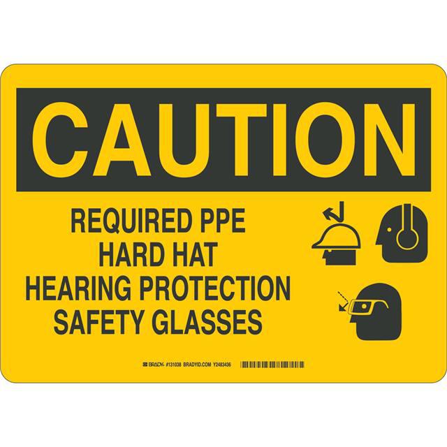 This is manufactured by Brady Corporation. The manufacturer part number is 131038. Label with a size of 14.00" l x 10.00" w (355.6mm x 254.0mm). The product is rohs3 compliant. It is assigned with possible HTSUS value of 3926.90.9985. It is shipped in bulk. It has a classic black legend, yellow background colour. The product brady®, is a highly preferred choice for users. The product is made from highly stable and reliable fiberglass. In addition, it is reach unaffected. Its typical moisture sensitivity level is not applicable. A bespoke label is a caution. required ppe hard hat hearing protection safety glasses label. It has a long 4 weeks standard lead time. The product is designated with the ear99 code number