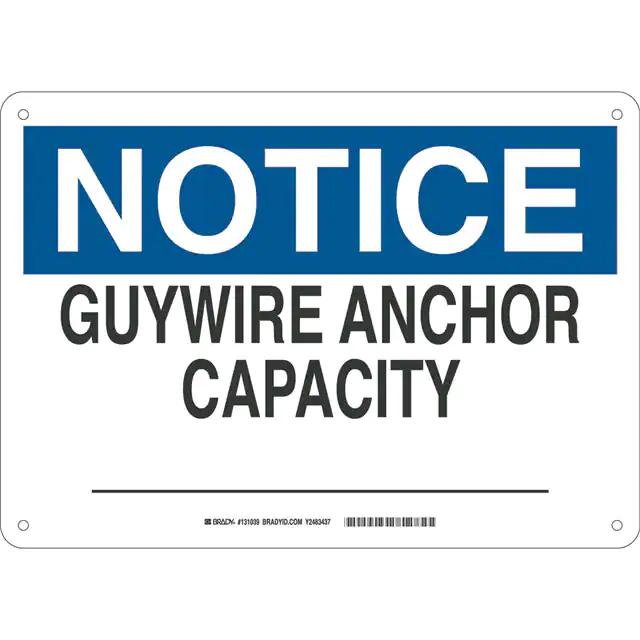 This is manufactured by Brady Corporation. The manufacturer part number is 131039. Label with a size of 14.00" l x 10.00" w (355.6mm x 254.0mm). The product is rohs3 compliant. It is assigned with possible HTSUS value of 3926.90.9985. It is shipped in bulk. It has a classic black and blue legend, white background colour. The product brady®, is a highly preferred choice for users. The product is made from highly stable and reliable fiberglass. In addition, it is reach unaffected. Its typical moisture sensitivity level is not applicable. A bespoke label is a notice. guywire anchor capacity label. The product is suitable for use with notice. It has a long 4 weeks standard lead time. The product is designated with the ear99 code number