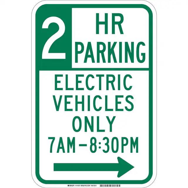 This is manufactured by Brady Corporation. The manufacturer part number is 141674. Label with a size of 18.00" l x 12.00" w (457.2mm x 304.8mm). The product is rohs3 compliant. It is assigned with possible HTSUS value of 8310.00.0000. It is shipped in bulk. It has a classic green legend, white background colour. The product brady®, is a highly preferred choice for users. The product is made from highly stable and reliable aluminum. In addition, it is reach unaffected. Its typical moisture sensitivity level is not applicable. A bespoke label is a 2 hr parking electric vehicles only 7 am-8:30 pm label. The product is suitable for use with voltage. It has a long 4 weeks standard lead time. The product is designated with the ear99 code number