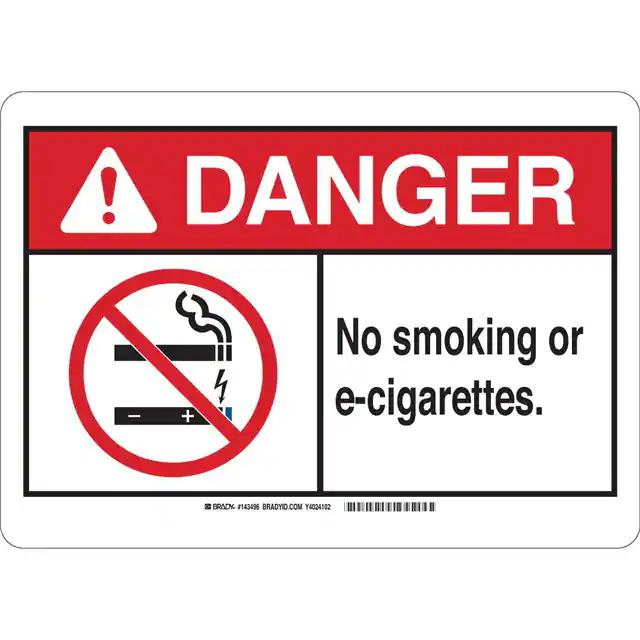 This is manufactured by Brady Corporation. The manufacturer part number is 143496. Label with a size of 14.00" l x 10.00" w (355.6mm x 254.0mm). The product is rohs3 compliant. It is assigned with possible HTSUS value of 3926.90.9985. It is shipped in bulk. It has a classic black, blue and red legend, white background colour. The product brady®, is a highly preferred choice for users. The product is made from highly stable and reliable polyester. In addition, it is reach unaffected. Its typical moisture sensitivity level is not applicable. A bespoke label is a danger. no smoking or e-cigarettes label. The product is suitable for use with danger. It has a long 4 weeks standard lead time. The product is designated with the ear99 code number