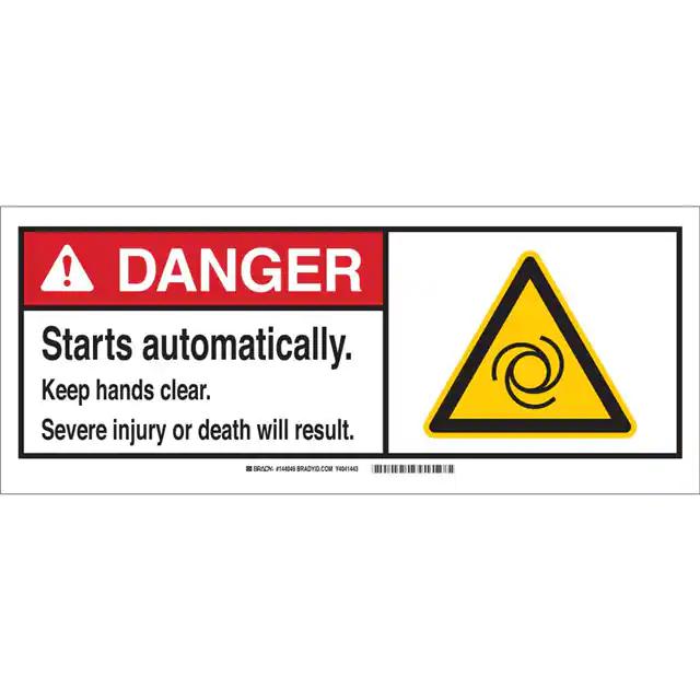 This is manufactured by Brady Corporation. The manufacturer part number is 144049. Label with a size of 17.00" l x 7.00" w (431.8mm x 177.8mm). The product is rohs3 compliant. It is assigned with possible HTSUS value of 3926.90.9985. It is shipped in bulk. It has a classic black, red and yellow legend, white background colour. The product brady®, is a highly preferred choice for users. The product is made from highly stable and reliable fiberglass. In addition, it is reach unaffected. Its typical moisture sensitivity level is not applicable. A bespoke label is a danger. starts automatically keep hands. clear severe injury or death will result label. The product is suitable for use with danger. It has a long 4 weeks standard lead time. The product is designated with the ear99 code number