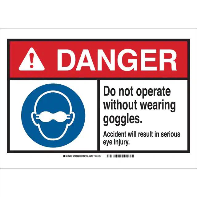 This is manufactured by Brady Corporation. The manufacturer part number is 144233. Label with a size of 14.00" l x 10.00" w (355.6mm x 254.0mm). The product is rohs3 compliant. It is assigned with possible HTSUS value of 8310.00.0000. It is shipped in bulk. It has a classic black, blue and red legend, white background colour. The product brady®, is a highly preferred choice for users. The product is made from highly stable and reliable aluminum. In addition, it is reach unaffected. Its typical moisture sensitivity level is not applicable. A bespoke label is a danger. do not operate without wearing goggles. accident will result in serious eye inju label. The product is suitable for use with danger. It has a long 4 weeks standard lead time. The product is designated with the ear99 code number
