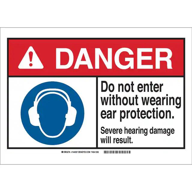 This is manufactured by Brady Corporation. The manufacturer part number is 144311. Label with a size of 14.00" l x 10.00" w (355.6mm x 254.0mm). The product is rohs3 compliant. It is assigned with possible HTSUS value of 8310.00.0000. It is shipped in bulk. It has a classic black, blue and red legend, white background colour. The product brady®, is a highly preferred choice for users. The product is made from highly stable and reliable aluminum. In addition, it is reach unaffected. Its typical moisture sensitivity level is not applicable. A bespoke label is a danger. do not enter without wearing ear protection.severe hearing damage will result label. The product is suitable for use with danger. It has a long 4 weeks standard lead time. The product is designated with the ear99 code number