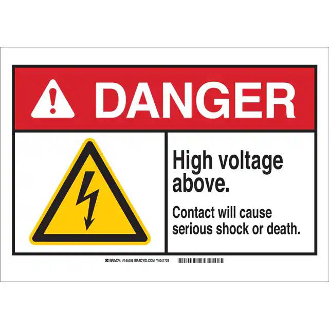 This is manufactured by Brady Corporation. The manufacturer part number is 144406. Label with a size of 20.00" l x 14.00" w (508.0mm x 355.6mm). The product is rohs3 compliant. It is assigned with possible HTSUS value of 3926.90.9985. It is shipped in bulk. It has a classic black, red and yellow legend, white background colour. The product brady®, is a highly preferred choice for users. The product is made from highly stable and reliable fiberglass. In addition, it is reach unaffected. Its typical moisture sensitivity level is not applicable. A bespoke label is a danger. high voltage above. contact will cause serious shock or death label. The product is suitable for use with voltage. It has a long 4 weeks standard lead time. The product is designated with the ear99 code number
