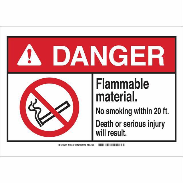 This is manufactured by Brady Corporation. The manufacturer part number is 145045. Label with a size of 14.00" l x 10.00" w (355.6mm x 254.0mm). The product is rohs3 compliant. It is assigned with possible HTSUS value of 3926.90.9985. It is shipped in bulk. It has a classic black and red legend, white background colour. The product brady®, is a highly preferred choice for users. The product is made from highly stable and reliable polyester. In addition, it is reach unaffected. Its typical moisture sensitivity level is not applicable. A bespoke label is a danger. flammable material. no smoking within 20 feet. death or serious injury will result label. The product is suitable for use with fire. It has a long 4 weeks standard lead time. The product is designated with the ear99 code number