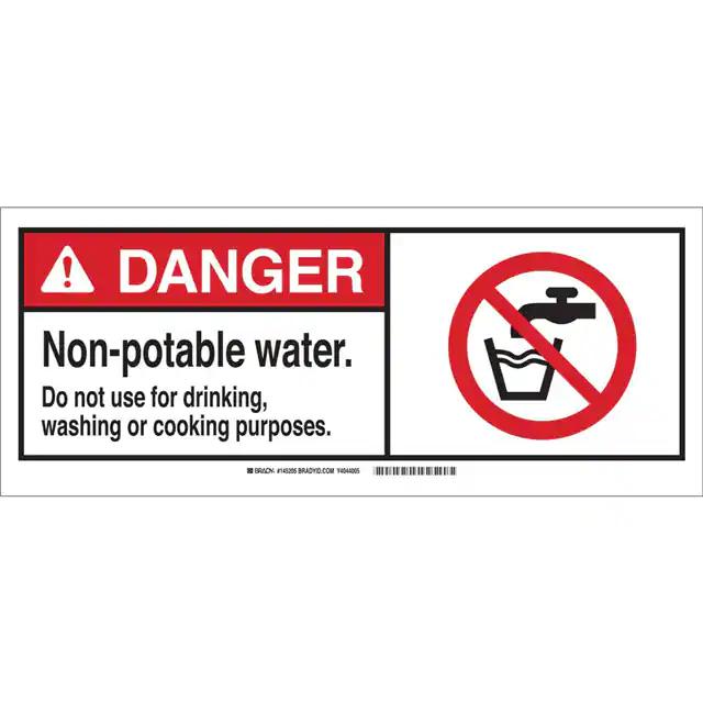 This is manufactured by Brady Corporation. The manufacturer part number is 145205. Label with a size of 17.00" l x 7.00" w (431.8mm x 177.8mm). The product is rohs3 compliant. It is assigned with possible HTSUS value of 3926.90.9985. It is shipped in bulk. It has a classic black and red legend, white background colour. The product brady®, is a highly preferred choice for users. The product is made from highly stable and reliable fiberglass. In addition, it is reach unaffected. Its typical moisture sensitivity level is not applicable. A bespoke label is a danger. non-potable water. do not use for drinking, washing or cooking purposes label. The product is suitable for use with warning. It has a long 4 weeks standard lead time. The product is designated with the ear99 code number