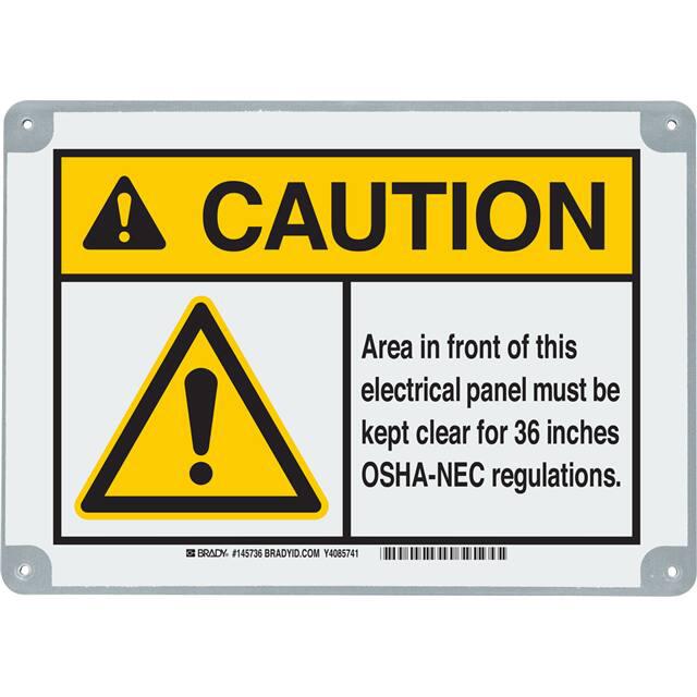 This is manufactured by Brady Corporation. The manufacturer part number is 145737. Label with a size of 14.00" l x 10.00" w (355.6mm x 254.0mm). The product is rohs3 compliant. It is assigned with possible HTSUS value of 3926.90.9985. It is shipped in bulk. It has a classic black and yellow legend, white background colour. The product brady®, is a highly preferred choice for users. The product is made from highly stable and reliable polypropylene. In addition, it is reach unaffected. Its typical moisture sensitivity level is not applicable. A bespoke label is a caution. area in front of this electrical panel must be kept clear for 36 inches osha-nec regulations label. The product is suitable for use with voltage. It has a long 4 weeks standard lead time. The product is designated with the ear99 code number