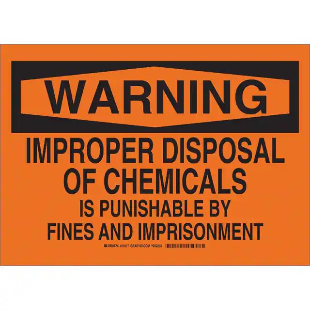This is manufactured by Brady Corporation. The manufacturer part number is 16117. Label with a size of 14.00" l x 10.00" w (355.6mm x 254.0mm). The product is not applicable. It is assigned with possible HTSUS value of 3926.90.9985. It is shipped in bulk. It has a classic black legend, orange background colour. The product brady®, is a highly preferred choice for users. The product is made from highly stable and reliable polyester. In addition, it is reach unaffected. Its typical moisture sensitivity level is not applicable. A bespoke label is a warning. improper disposal of chemicals is punishable by fines and imprisonment label. The product is suitable for use with warning. It has a long 4 weeks standard lead time. The product is designated with the ear99 code number