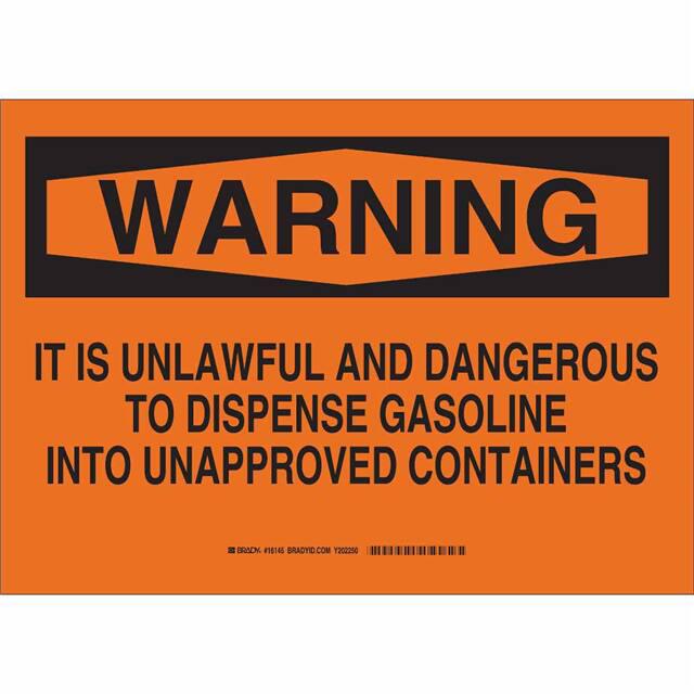 This is manufactured by Brady Corporation. The manufacturer part number is 16145. Label with a size of 14.00" l x 10.00" w (355.6mm x 254.0mm). The product is rohs3 compliant. It is assigned with possible HTSUS value of 8310.00.0000. It is shipped in bulk. It has a classic black legend, orange background colour. The product brady®, is a highly preferred choice for users. The product is made from highly stable and reliable aluminum. In addition, it is reach unaffected. Its typical moisture sensitivity level is not applicable. A bespoke label is a warning. it is unlawful and dangerous to dispense gasoline into unapproved containers label. The product is suitable for use with danger. It has a long 4 weeks standard lead time. The product is designated with the ear99 code number