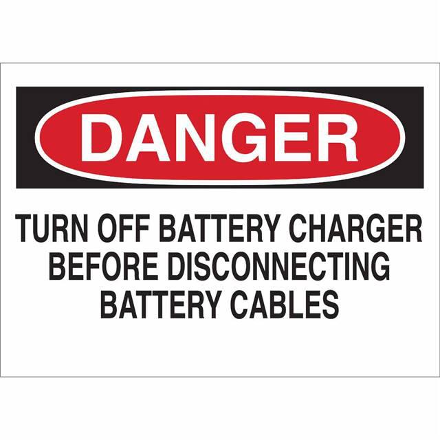 This is manufactured by Brady Corporation. The manufacturer part number is 16954. Label with a size of 14.00" l x 10.00" w (355.6mm x 254.0mm). The product is rohs3 compliant. It is assigned with possible HTSUS value of 8310.00.0000. It is shipped in bulk. It has a classic black and red legend, white background colour. The product brady®, is a highly preferred choice for users. The product is made from highly stable and reliable aluminum. In addition, it is reach unaffected. Its typical moisture sensitivity level is not applicable. A bespoke label is a danger. turn off battery charger before disconnecting battery cables label. The product is suitable for use with danger. It has a long 4 weeks standard lead time. The product is designated with the ear99 code number