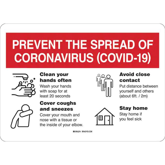 This is manufactured by Brady Corporation. The manufacturer part number is 170162. Label with a size of 10.00" l x 7.00" w (254.0mm x 177.8mm). The product is rohs compliant. It is assigned with possible HTSUS value of 3926.90.9985. It is shipped in bulk. It has a classic black and red legend, white background colour. The product b-401, is a highly preferred choice for users. The product is made from highly stable and reliable plastic. Its typical moisture sensitivity level is not applicable. A bespoke label is a prevent the spread of coronavirus (covid-19). clean your hands often. wash your hand with soap for at least 20 seconds… label. The product is suitable for use with notice. The product is designated with the ear99 code number