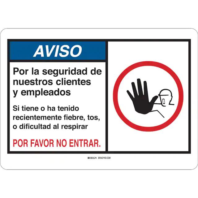 This is manufactured by Brady Corporation. The manufacturer part number is 170283. Label with a size of 10.00" l x 7.00" w (254.0mm x 177.8mm). The product is not applicable. It is assigned with possible HTSUS value of 3926.90.9985. It is shipped in bulk. It has a classic black legend, white background colour. The product b-401, is a highly preferred choice for users. The product is made from highly stable and reliable plastic. Its typical moisture sensitivity level is not applicable. A bespoke label is a aviso. por la seguridad de nuestros clientes y empleados. si tiene o ha tenido recientemente fiebre, tos, o dificultad al respirar… label. The product is suitable for use with notice. The product is designated with the ear99 code number