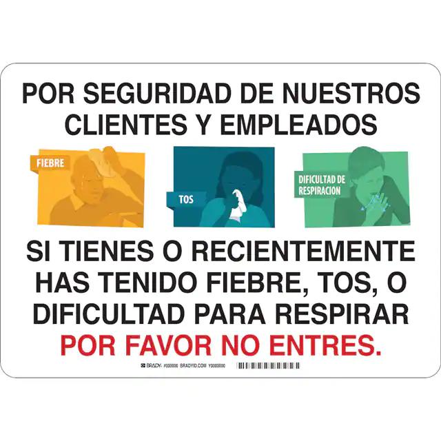 This is manufactured by Brady Corporation. The manufacturer part number is 170307. Label with a size of 10.00" l x 7.00" w (254.0mm x 177.8mm). The product is not applicable. It is assigned with possible HTSUS value of 3926.90.9985. It is shipped in bulk. It has a classic black and red legend, white background colour. The product b-401, is a highly preferred choice for users. The product is made from highly stable and reliable plastic. Its typical moisture sensitivity level is not applicable. A bespoke label is a por seguridad de nuestros clientes y empleados. si tienes o recientemente has tenido fiebre, tos, o dificultad para respirar… label. The product is suitable for use with notice. The product is designated with the ear99 code number