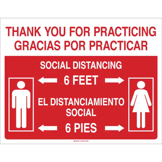 This is manufactured by Brady Corporation. The manufacturer part number is 170323. Label with a size of 10.00" l x 7.00" w (254.0mm x 177.8mm). The product is not applicable. It is assigned with possible HTSUS value of 3926.90.9985. It is shipped in bulk. It has a classic red legend, white background colour. The product b-401, is a highly preferred choice for users. The product is made from highly stable and reliable plastic. Its typical moisture sensitivity level is not applicable. A bespoke label is a thank you for practicing. gracias por practicar. social distancing. 6 feet. el distanciamiento social. 6 pies. label. The product is suitable for use with notice. The product is designated with the ear99 code number