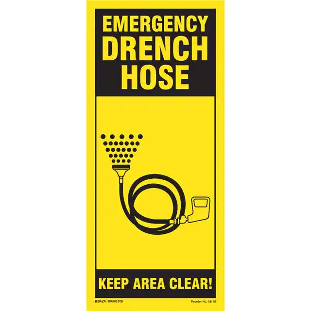 This is manufactured by Brady Corporation. The manufacturer part number is 18119LS. Label with a size of 18.00" l x 8.00" w (457.2mm x 203.2mm). The product is rohs3 compliant. It is assigned with possible HTSUS value of 3926.90.9985. It is shipped in bulk. It has a classic black legend, yellow background colour. The product brady®, is a highly preferred choice for users. The product is made from highly stable and reliable polyethylene. In addition, it is reach unaffected. Its typical moisture sensitivity level is not applicable. A bespoke label is a emergency drench hose. keep area clear label. The product is suitable for use with emergency. It has a long 4 weeks standard lead time. The product is designated with the ear99 code number