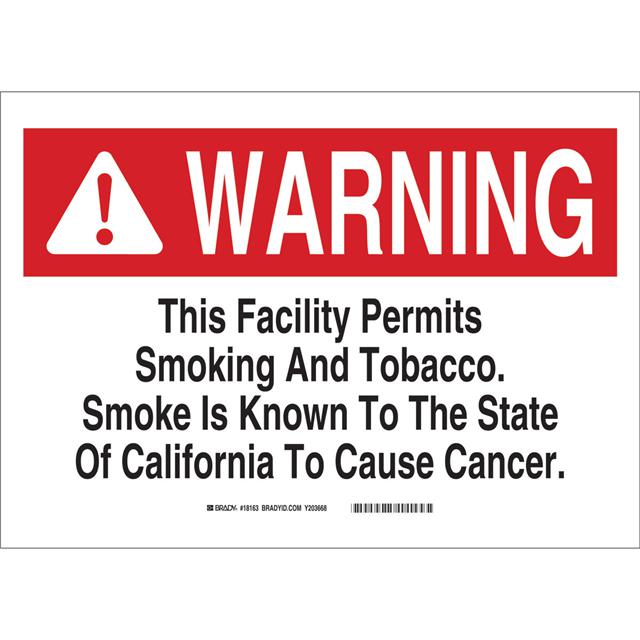 This is manufactured by Brady Corporation. The manufacturer part number is 18163. Label with a size of 14.00" l x 10.00" w (355.6mm x 254.0mm). The product is rohs3 compliant. It is assigned with possible HTSUS value of 3926.90.9985. It is shipped in bulk. It has a classic black and red legend, white background colour. The product brady®, is a highly preferred choice for users. The product is made from highly stable and reliable polyester. In addition, it is reach unaffected. Its typical moisture sensitivity level is not applicable. A bespoke label is a warning. this facility permits smoking and tobacco. smoke is known to the state of california to cause cancer label. The product is suitable for use with warning. It has a long 4 weeks standard lead time. The product is designated with the ear99 code number