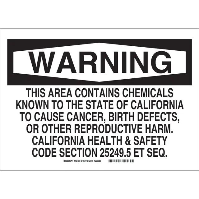 This is manufactured by Brady Corporation. The manufacturer part number is 18184. Label with a size of 14.00" l x 10.00" w (355.6mm x 254.0mm). The product is rohs3 compliant. It is assigned with possible HTSUS value of 8310.00.0000. It is shipped in bulk. It has a classic black legend, white background colour. The product brady®, is a highly preferred choice for users. The product is made from highly stable and reliable aluminum. In addition, it is reach unaffected. Its typical moisture sensitivity level is not applicable. A bespoke label is a warning. this area contains chemicals known to the state of california to cause cancer, birth defects, or other reproductive harm. label. The product is suitable for use with warning. It has a long 4 weeks standard lead time. The product is designated with the ear99 code number