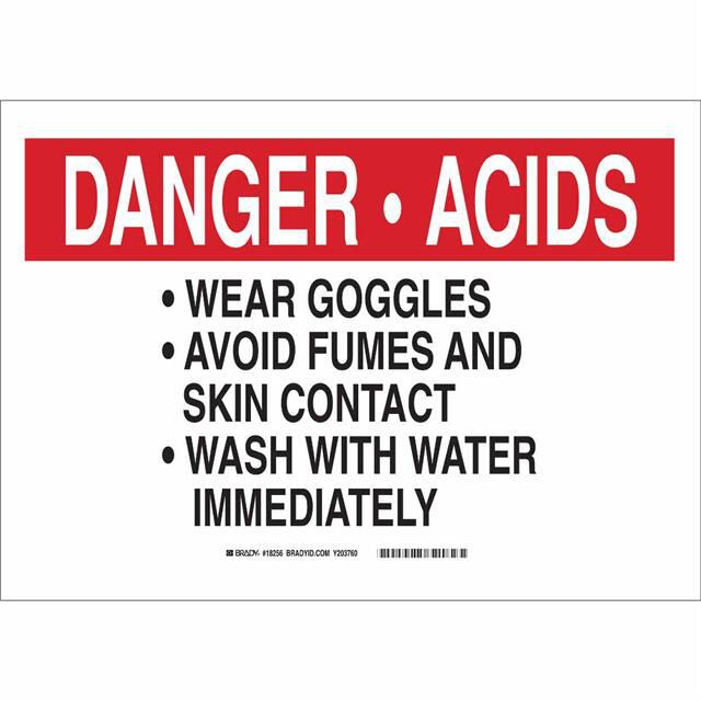 This is manufactured by Brady Corporation. The manufacturer part number is 18256. Label with a size of 14.00" l x 10.00" w (355.6mm x 254.0mm). The product is rohs3 compliant. It is assigned with possible HTSUS value of 3926.90.9985. It is shipped in bulk. It has a classic black and red legend, white background colour. The product brady®, is a highly preferred choice for users. The product is made from highly stable and reliable polyester. In addition, it is reach unaffected. Its typical moisture sensitivity level is not applicable. A bespoke label is a danger acids. wear goggles avoid fumes and skin contact wash with water immediately label. The product is suitable for use with danger. It has a long 4 weeks standard lead time. The product is designated with the ear99 code number