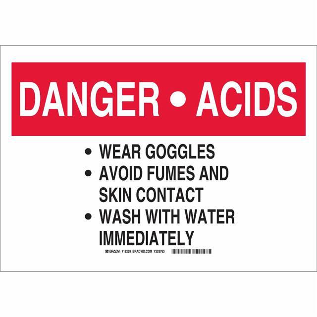 This is manufactured by Brady Corporation. The manufacturer part number is 18259. Label with a size of 14.00" l x 10.00" w (355.6mm x 254.0mm). The product is rohs3 compliant. It is assigned with possible HTSUS value of 8310.00.0000. It is shipped in bulk. It has a classic black and red legend, white background colour. The product brady®, is a highly preferred choice for users. The product is made from highly stable and reliable aluminum. In addition, it is reach unaffected. Its typical moisture sensitivity level is not applicable. A bespoke label is a danger acids. wear goggles avoid fumes and skin contact wash with water immediately label. The product is suitable for use with danger. It has a long 4 weeks standard lead time. The product is designated with the ear99 code number