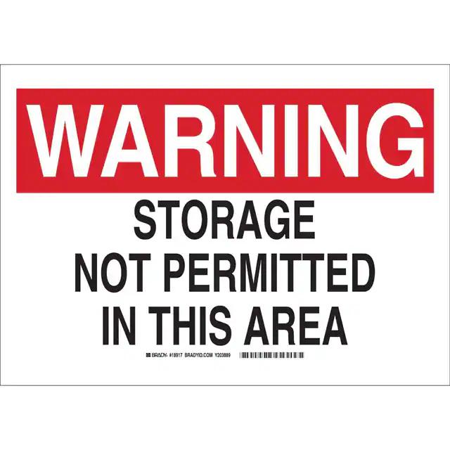This is manufactured by Brady Corporation. The manufacturer part number is 18917. Label with a size of 14.00" l x 10.00" w (355.6mm x 254.0mm). The product is rohs3 compliant. It is assigned with possible HTSUS value of 8310.00.0000. It is shipped in bulk. It has a classic black and red legend, white background colour. The product brady®, is a highly preferred choice for users. The product is made from highly stable and reliable aluminum. In addition, it is reach unaffected. Its typical moisture sensitivity level is not applicable. A bespoke label is a warning. storage not permitted in this area label. The product is suitable for use with warning. It has a long 4 weeks standard lead time. The product is designated with the ear99 code number