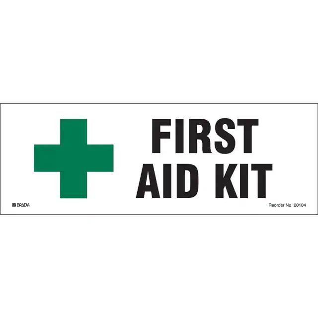 This is manufactured by Brady Corporation. The manufacturer part number is 20104MLS. Label with a size of 10.00" l x 3.50" w (254.0mm x 88.9mm). The product is rohs3 compliant. It is assigned with possible HTSUS value of 3926.90.9985. It is shipped in bulk. It has a classic black and green legend, white background colour. The product brady®, is a highly preferred choice for users. The product is made from highly stable and reliable vinyl. In addition, it is reach unaffected. Its typical moisture sensitivity level is not applicable. A bespoke label is a first aid kit label. The product is suitable for use with safety. It has a long 4 weeks standard lead time. The product is designated with the ear99 code number