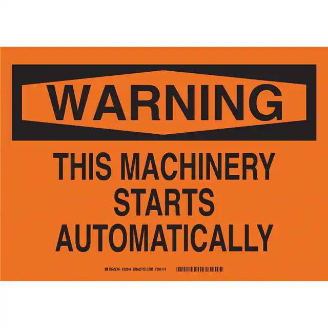 This is manufactured by Brady Corporation. The manufacturer part number is 23949. Label with a size of 14.00" l x 10.00" w (355.6mm x 254.0mm). The product is not applicable. It is assigned with possible HTSUS value of 3926.90.9985. It is shipped in bulk. It has a classic black legend, orange background colour. The product brady®, is a highly preferred choice for users. The product is made from highly stable and reliable fiberglass. In addition, it is reach unaffected. Its typical moisture sensitivity level is not applicable. A bespoke label is a warning. this machine starts automatically label. The product is suitable for use with warning. It has a long 4 weeks standard lead time. The product is designated with the ear99 code number