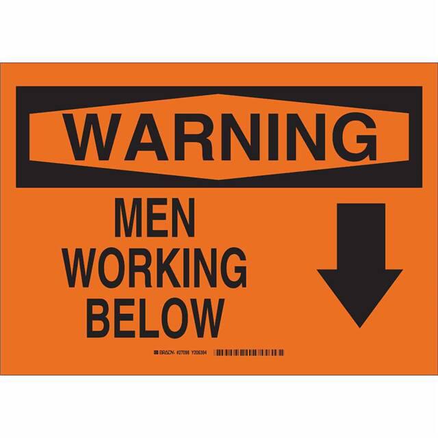This is manufactured by Brady Corporation. The manufacturer part number is 27098. Label with a size of 14.00" l x 10.00" w (355.6mm x 254.0mm). The product is rohs3 compliant. It is assigned with possible HTSUS value of 8310.00.0000. It is shipped in bulk. It has a classic black legend, orange background colour. The product brady®, is a highly preferred choice for users. The product is made from highly stable and reliable aluminum. In addition, it is reach unaffected. Its typical moisture sensitivity level is not applicable. A bespoke label is a warning. men working below label. The product is suitable for use with warning. It has a long 4 weeks standard lead time. The product is designated with the ear99 code number