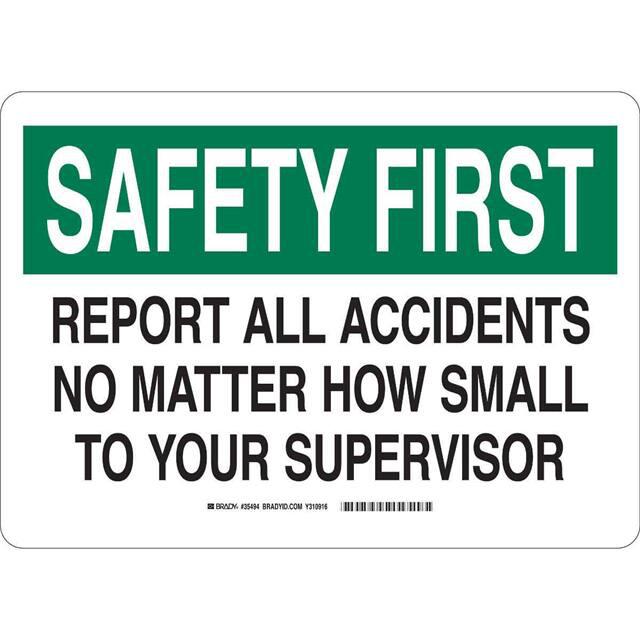 This is manufactured by Brady Corporation. The manufacturer part number is 35494. Label with a size of 14.00" l x 10.00" w (355.6mm x 254.0mm). The product is not applicable. It is assigned with possible HTSUS value of 3926.90.9985. It is shipped in bulk. It has a classic black and green legend, white background colour. The product brady®, is a highly preferred choice for users. The product is made from highly stable and reliable fiberglass. In addition, it is reach unaffected. Its typical moisture sensitivity level is not applicable. A bespoke label is a safety first. report all accidents no matter how small to your supervisor label. The product is suitable for use with safety. It has a long 4 weeks standard lead time. The product is designated with the ear99 code number
