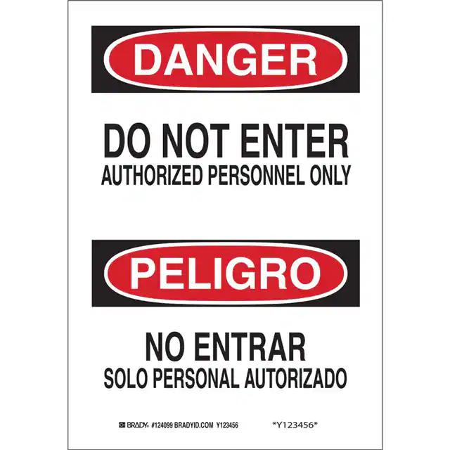 This is manufactured by Brady Corporation. The manufacturer part number is 38104. Label with a size of 14.00" l x 10.00" w (355.6mm x 254.0mm). The product is rohs3 compliant. It is assigned with possible HTSUS value of 8310.00.0000. It is shipped in bulk. It has a classic black and red legend, white background colour. The product brady®, is a highly preferred choice for users. The product is made from highly stable and reliable aluminum. In addition, it is reach unaffected. Its typical moisture sensitivity level is not applicable. A bespoke label is a danger/peligro. do not enter authorized personnel only/no entre solo personal autorizado label. The product is suitable for use with danger. It has a long 4 weeks standard lead time. The product is designated with the ear99 code number