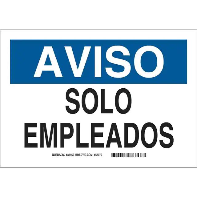 This is manufactured by Brady Corporation. The manufacturer part number is 38159. Label with a size of 14.00" l x 10.00" w (355.6mm x 254.0mm). The product is rohs3 compliant. It is assigned with possible HTSUS value of 8310.00.0000. It is shipped in bulk. It has a classic black and blue legend, white background colour. The product brady®, is a highly preferred choice for users. The product is made from highly stable and reliable aluminum. In addition, it is reach unaffected. Its typical moisture sensitivity level is not applicable. A bespoke label is a aviso. solo empleados label. The product is suitable for use with notice. It has a long 4 weeks standard lead time. The product is designated with the ear99 code number