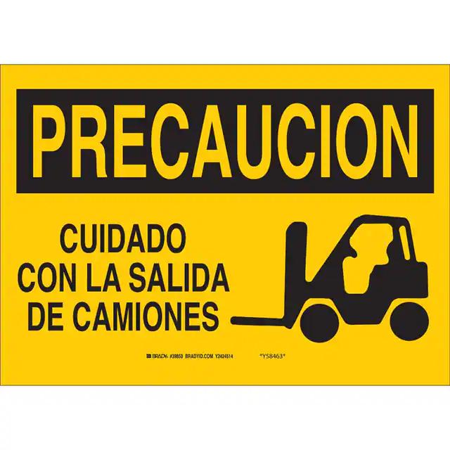 This is manufactured by Brady Corporation. The manufacturer part number is 38474. Label with a size of 14.00" l x 10.00" w (355.6mm x 254.0mm). The product is not applicable. It is assigned with possible HTSUS value of 8310.00.0000. It is shipped in bulk. It has a classic black legend, yellow background colour. The product brady®, is a highly preferred choice for users. The product is made from highly stable and reliable aluminum. In addition, it is reach affected. Its typical moisture sensitivity level is not applicable. A bespoke label is a precaucion. cuidado con la salida de camiones label. The product is suitable for use with caution. It has a long 4 weeks standard lead time. The product is designated with the ear99 code number