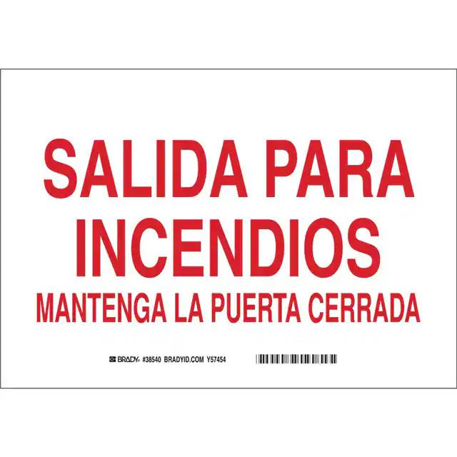 This is manufactured by Brady Corporation. The manufacturer part number is 38540. Label with a size of 14.00" l x 10.00" w (355.6mm x 254.0mm). The product is rohs3 compliant. It is assigned with possible HTSUS value of 8310.00.0000. It is shipped in bulk. It has a classic red legend, white background colour. The product brady®, is a highly preferred choice for users. The product is made from highly stable and reliable aluminum. In addition, it is reach unaffected. Its typical moisture sensitivity level is not applicable. A bespoke label is a salida para incendios mantenga la puerta cerrada label. The product is suitable for use with notice. It has a long 4 weeks standard lead time. The product is designated with the ear99 code number