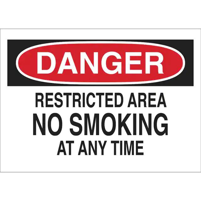 This is manufactured by Brady Corporation. The manufacturer part number is 42666. Label with a size of 14.00" l x 10.00" w (355.6mm x 254.0mm). The product is rohs3 compliant. It is assigned with possible HTSUS value of 8310.00.0000. It is shipped in bulk. It has a classic black and red legend, white background colour. The product brady®, is a highly preferred choice for users. The product is made from highly stable and reliable aluminum. In addition, it is reach unaffected. Its typical moisture sensitivity level is not applicable. A bespoke label is a danger. restricted area no smoking at any time label. The product is suitable for use with danger. It has a long 4 weeks standard lead time. The product is designated with the ear99 code number