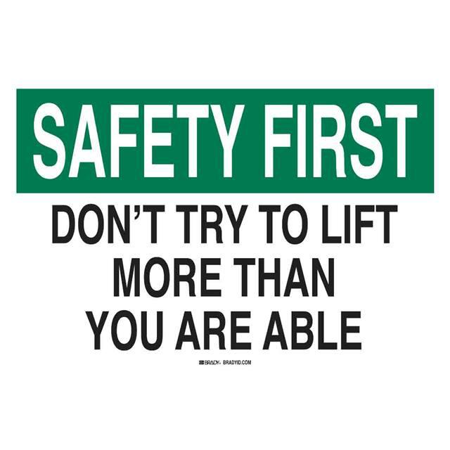 This is manufactured by Brady Corporation. The manufacturer part number is 42889. Label with a size of 14.00" l x 10.00" w (355.6mm x 254.0mm). The product is rohs3 compliant. It is assigned with possible HTSUS value of 8310.00.0000. It is shipped in bulk. It has a classic black and green legend, white background colour. The product brady®, is a highly preferred choice for users. The product is made from highly stable and reliable aluminum. In addition, it is reach unaffected. Its typical moisture sensitivity level is not applicable. A bespoke label is a safety first. don't try to lift more than you are able label. The product is suitable for use with safety. It has a long 4 weeks standard lead time. The product is designated with the ear99 code number