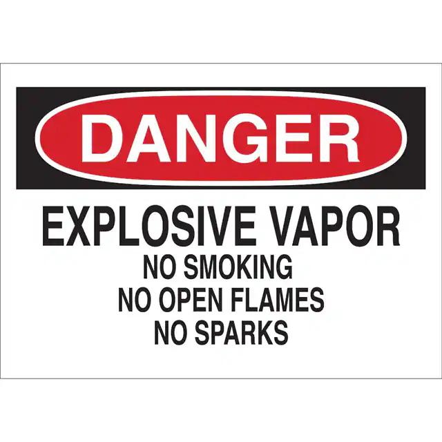 This is manufactured by Brady Corporation. The manufacturer part number is 43230. Label with a size of 14.00" l x 10.00" w (355.6mm x 254.0mm). The product is rohs3 compliant. It is assigned with possible HTSUS value of 8310.00.0000. It is shipped in bulk. It has a classic black and red legend, white background colour. The product brady®, is a highly preferred choice for users. The product is made from highly stable and reliable aluminum. In addition, it is reach unaffected. Its typical moisture sensitivity level is not applicable. A bespoke label is a danger. explosive vapor no smoking no open flames no sparks label. The product is suitable for use with danger. It has a long 4 weeks standard lead time. The product is designated with the ear99 code number