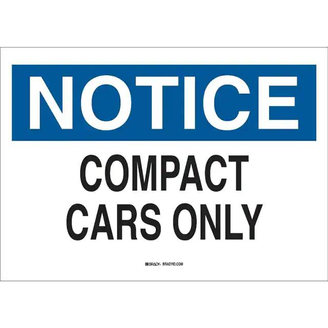 This is manufactured by Brady Corporation. The manufacturer part number is 43400. Label with a size of 14.00" l x 10.00" w (355.6mm x 254.0mm). The product is rohs3 compliant. It is assigned with possible HTSUS value of 8310.00.0000. It is shipped in bulk. It has a classic black and blue legend, white background colour. The product brady®, is a highly preferred choice for users. The product is made from highly stable and reliable aluminum. In addition, it is reach unaffected. Its typical moisture sensitivity level is not applicable. A bespoke label is a notice. compact cars only label. The product is suitable for use with notice. It has a long 4 weeks standard lead time. The product is designated with the ear99 code number