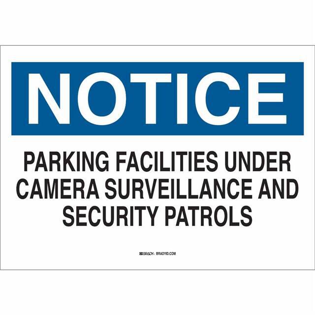This is manufactured by Brady Corporation. The manufacturer part number is 43408. Label with a size of 14.00" l x 10.00" w (355.6mm x 254.0mm). The product is rohs3 compliant. It is assigned with possible HTSUS value of 8310.00.0000. It is shipped in bulk. It has a classic black and blue legend, white background colour. The product brady®, is a highly preferred choice for users. The product is made from highly stable and reliable aluminum. In addition, it is reach unaffected. Its typical moisture sensitivity level is not applicable. A bespoke label is a notice. parking facilities under camera surveillance and security patrols label. The product is suitable for use with notice. It has a long 4 weeks standard lead time. The product is designated with the ear99 code number