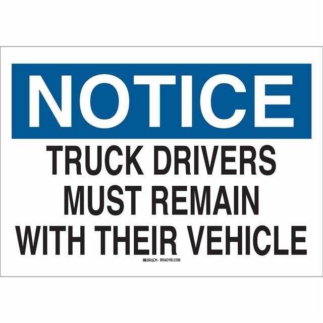 This is manufactured by Brady Corporation. The manufacturer part number is 43411. Label with a size of 14.00" l x 10.00" w (355.6mm x 254.0mm). The product is rohs3 compliant. It is assigned with possible HTSUS value of 8310.00.0000. It is shipped in bulk. It has a classic black and blue legend, white background colour. The product brady®, is a highly preferred choice for users. The product is made from highly stable and reliable aluminum. In addition, it is reach unaffected. Its typical moisture sensitivity level is not applicable. A bespoke label is a notice. truck drivers must remain with their vehicle label. The product is suitable for use with notice. It has a long 4 weeks standard lead time. The product is designated with the ear99 code number