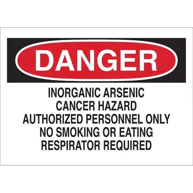 This is manufactured by Brady Corporation. The manufacturer part number is 43505. Label with a size of 14.00" l x 10.00" w (355.6mm x 254.0mm). The product is rohs3 compliant. It is assigned with possible HTSUS value of 8310.00.0000. It is shipped in bulk. It has a classic black and red legend, white background colour. The product brady®, is a highly preferred choice for users. The product is made from highly stable and reliable aluminum. In addition, it is reach unaffected. Its typical moisture sensitivity level is not applicable. A bespoke label is a danger. inorganic arsenic cancer hazard authorized personnel only no smoking or eating respirator required label. The product is suitable for use with danger. It has a long 4 weeks standard lead time. The product is designated with the ear99 code number