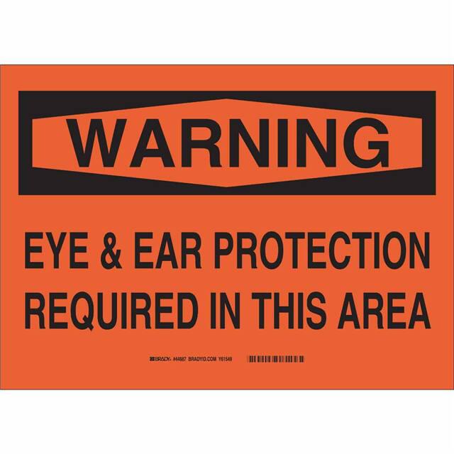 This is manufactured by Brady Corporation. The manufacturer part number is 44687. Label with a size of 14.00" l x 10.00" w (355.6mm x 254.0mm). The product is rohs3 compliant. It is assigned with possible HTSUS value of 3926.90.9985. It is shipped in bulk. It has a classic black legend, orange background colour. The product brady®, is a highly preferred choice for users. The product is made from highly stable and reliable fiberglass. In addition, it is reach unaffected. Its typical moisture sensitivity level is not applicable. A bespoke label is a warning. eye. ear protection required in this area label. The product is suitable for use with warning. It has a long 4 weeks standard lead time. The product is designated with the ear99 code number