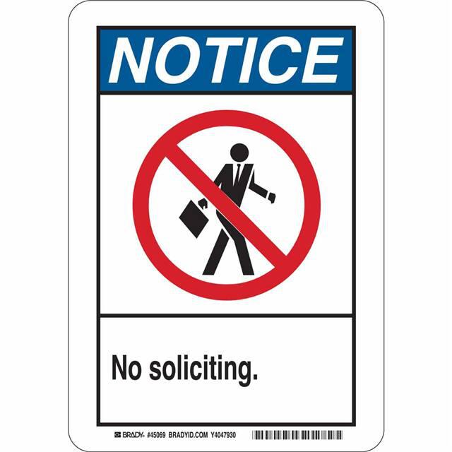 This is manufactured by Brady Corporation. The manufacturer part number is 48990. Label with a size of 14.00" l x 10.00" w (355.6mm x 254.0mm). The product is rohs3 compliant. It is assigned with possible HTSUS value of 8310.00.0000. It is shipped in bulk. It has a classic black, blue and red legend, white background colour. The product brady®, is a highly preferred choice for users. The product is made from highly stable and reliable aluminum. In addition, it is reach unaffected. Its typical moisture sensitivity level is not applicable. A bespoke label is a notice. no soliciting label. The product is suitable for use with notice. It has a long 4 weeks standard lead time. The product is designated with the ear99 code number