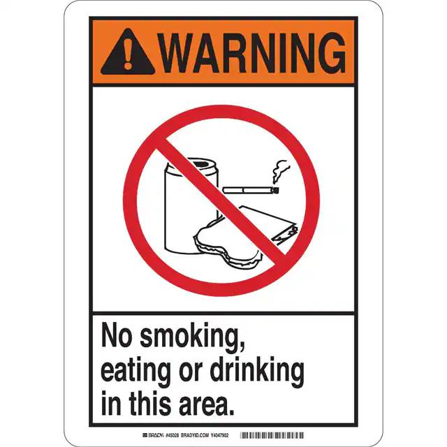 This is manufactured by Brady Corporation. The manufacturer part number is 49016. Label with a size of 14.00" l x 10.00" w (355.6mm x 254.0mm). The product is rohs3 compliant. It is assigned with possible HTSUS value of 8310.00.0000. It is shipped in bulk. It has a classic black, orange and red legend, white background colour. The product brady®, is a highly preferred choice for users. The product is made from highly stable and reliable aluminum. In addition, it is reach unaffected. Its typical moisture sensitivity level is not applicable. A bespoke label is a warning. no smoking, eating or drinking in this area. label. The product is suitable for use with warning. It has a long 4 weeks standard lead time. The product is designated with the ear99 code number