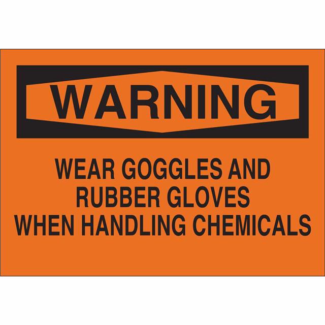This is manufactured by Brady Corporation. The manufacturer part number is 69615. Label with a size of 14.00" l x 10.00" w (355.6mm x 254.0mm). The product is rohs3 compliant. It is assigned with possible HTSUS value of 3926.90.9985. It is shipped in bulk. It has a classic black legend, orange background colour. The product brady®, is a highly preferred choice for users. The product is made from highly stable and reliable fiberglass. In addition, it is reach unaffected. Its typical moisture sensitivity level is not applicable. A bespoke label is a warning. wear goggles and rubber gloves when handling chemicals label. The product is suitable for use with warning. It has a long 4 weeks standard lead time. The product is designated with the ear99 code number