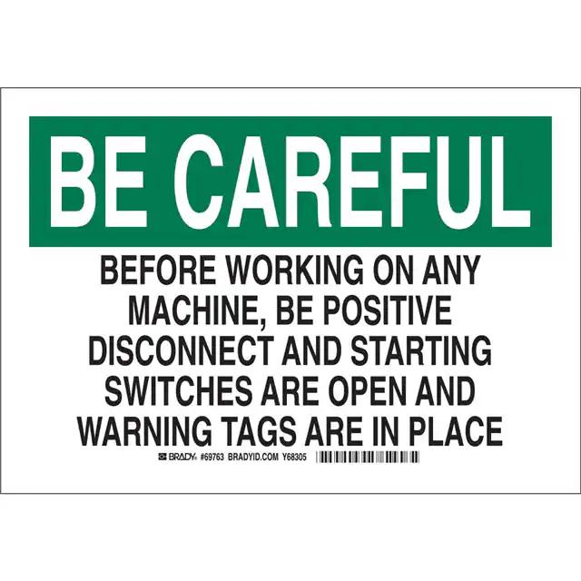 This is manufactured by Brady Corporation. The manufacturer part number is 69763. Label with a size of 14.00" l x 10.00" w (355.6mm x 254.0mm). The product is rohs3 compliant. It is assigned with possible HTSUS value of 3926.90.9985. It is shipped in bulk. It has a classic black and green legend, white background colour. The product brady®, is a highly preferred choice for users. The product is made from highly stable and reliable fiberglass. In addition, it is reach unaffected. Its typical moisture sensitivity level is not applicable. A bespoke label is a be careful. before working on any machine, be positive disconnect and starting switches are open and warning tags are in place label. The product is suitable for use with warning. It has a long 4 weeks standard lead time. The product is designated with the ear99 code number